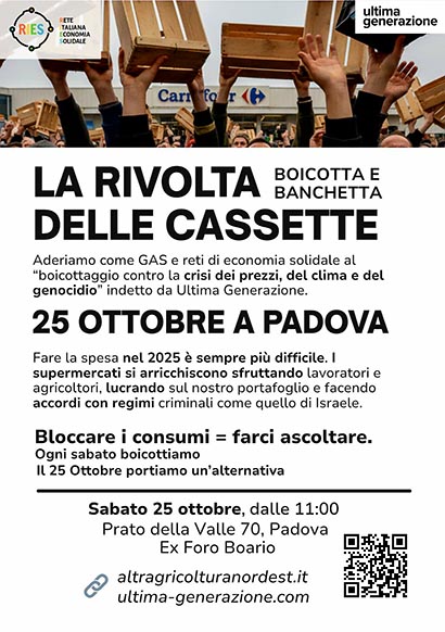 Care e cari, sabato 25 ottobre, in collaborazione con Ultima Generazione, il Gruppo di Acquisto Solidale di AltrAgricoltura parteciperà ad una iniziativa di boicottaggio davanti al supermercato Despar di Prato della Valle!