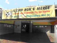 La sede di AltrAgricoltura Nord Est si trova in corso Australia, vicino al teatro Geox, in una parte di quello che una volta era l’ex macello. Da fuori si presenta come una costruzione fantasma, grigia e poco accogliente. L’unica cosa che denota la presenza dell’associazione è uno striscione che denuncia gli OGM.