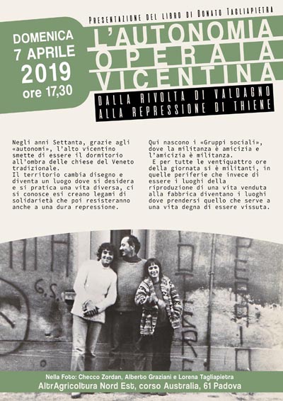 7 Aprile 1979 - 7 Aprile 2019 - PADOVA - Presentazione del libro «Gli autonomi. L'Autonomia Operaia vicentina. Dalla rivolta di Valdagno alla repressione di Thiene» (Ed. Derive Approdi)